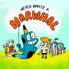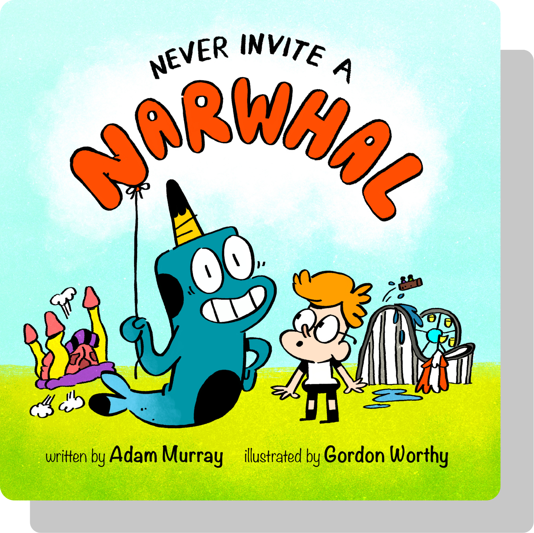Illustration of a cartoon narwhal holding balloons, a child, and a seal with a cake on its head, under the title "Never Invite a Narwhal." Brightly colored scenery with mushrooms and a rainbow. Text credits Adam Murray as the writer and Gordon Worthy as the illustrator.