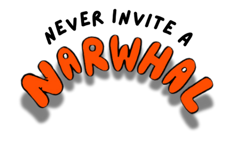 Curved text saying 'NARWHAL' in bold orange letters on a black background.