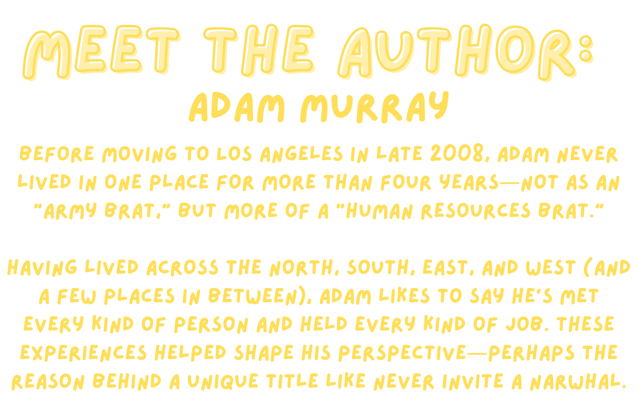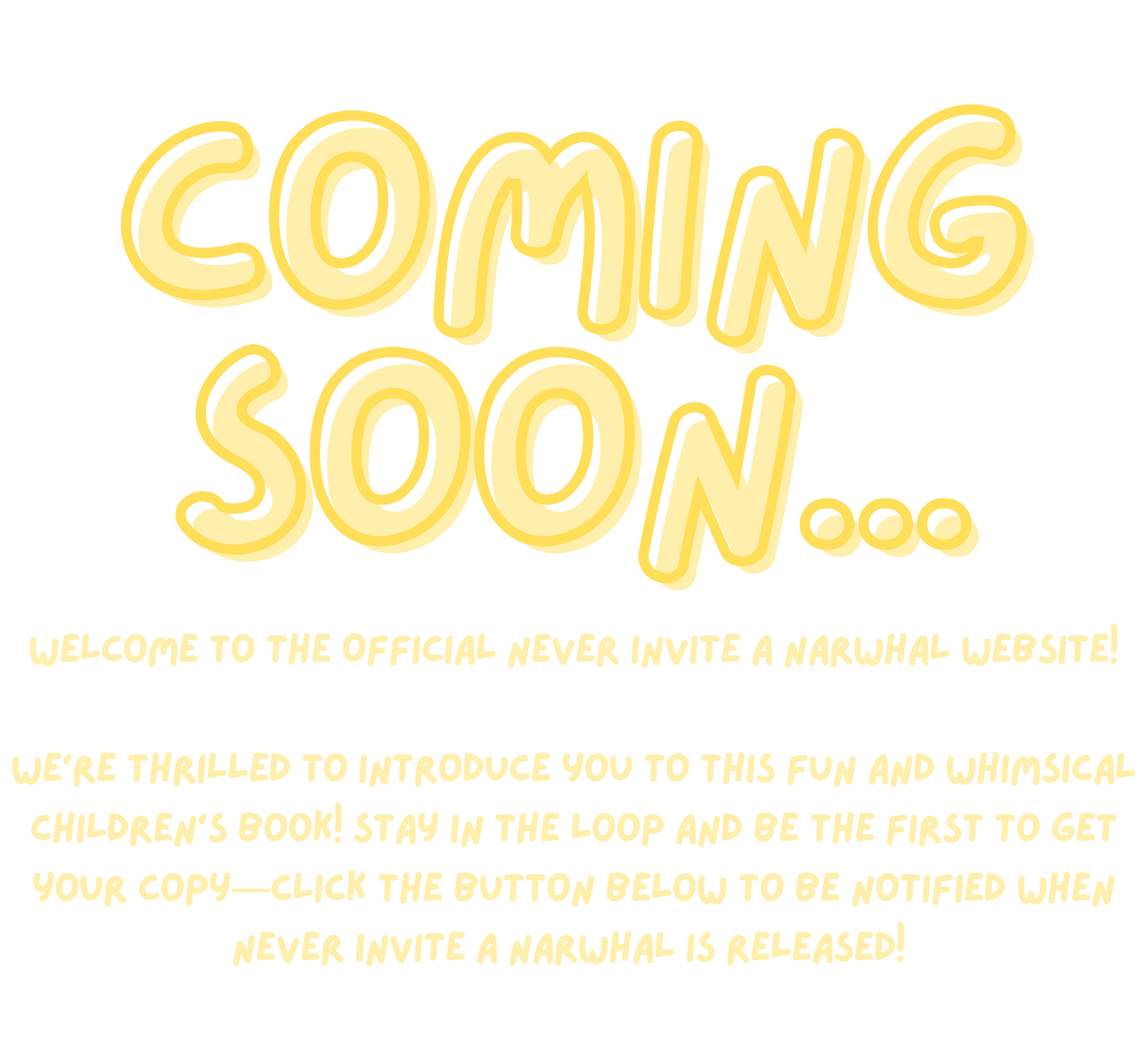 Yellow text on black background reads "Coming Soon... Welcome to the official Never Invite a Narwhal website! We’re thrilled to introduce you to this fun and whimsical children’s book! Stay in the loop and be the first to get your copy—click the button below to be notified when Never Invite a Narwhal is released!"